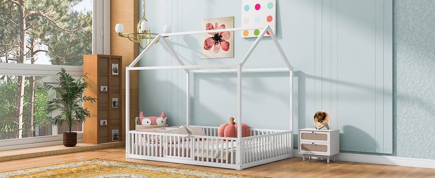 With a roof, fence and a small door that can be opened and closed, this bed offers an enclosed play area perfect for exploring their imagination. This bed has a washed old design, regardless of gender, suitable for different people. This bed comes with a fence and a sturdy metal frame, providing a safe space for your child to get a good night sleep.